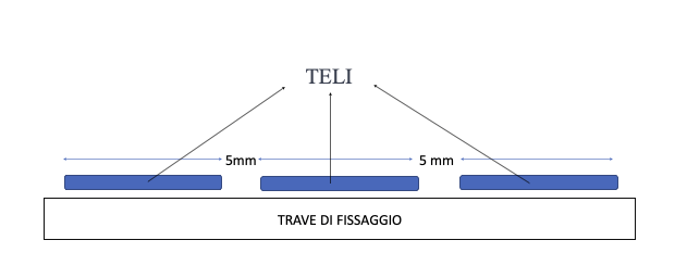 Per quel che riguarda la larghezza del telo, invece, sempre usando un metro flessibile a rullina, bisogna rilevarne la misura. Successivamente dividerla per il numero delle fasce desiderate (consigliamo sempre numero dispari), e considerare una distanza di 5 mm tra una fascia e l’altra. Quest’ultima operazione serve per evitare che si tocchino i teli tra di loro e che, a lungo andare, vadano a rovinarsi sul punto di contatto.